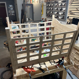 Vugge laget av eik. Vuggen er sammenleggbar slik at den lett kan stues bort etter bruk. Behandlet med: Dansk Treolje. Kan lages i bjørk, eik, furu, bøk.