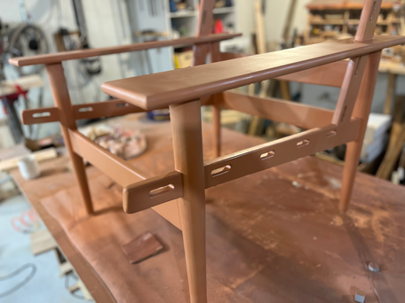 Jeg er i gang med en prototype av en stol. Stolen er inspirert av en gammel stol designet av Erling Jessen i 1960. Den endelige stolen skal lages i bøk eller eik med seter og rygg i skinn.